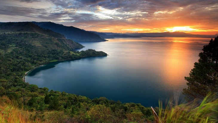 Keindahan Danau Toba terpancar dari airnya yang biru jernih, dikelilingi oleh perbukitan hijau yang menjulang tinggi. Pemandangan matahari terbit dan terbenam di danau ini adalah lukisan alam yang tak terlupakan, dengan warna-warni langit yang memantul sempurna di permukaan air yang tenang. Udara yang sejuk dan segar menambah daya tarik danau ini sebagai tempat pelarian yang ideal dari hiruk pikuk kehidupan kota.