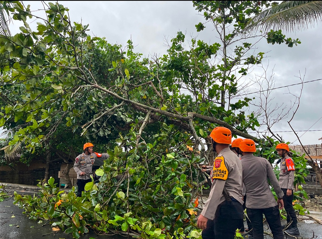 Berita Pangandaran (Isikata)- Tim SAR Sat Samapta Polres Pangandaran bergerak cepat mengevakuasi sebuah pohon besar yang tumbang dan melintang di jalan menuju objek wisata Batu Hiu, Kecamatan Parigi, Pangandaran. Kejadian yang dipicu oleh angin kencang ini sempat melumpuhkan akses lalu lintas di kawasan tersebut.